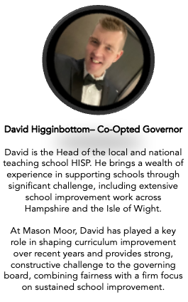| Mr David Higginbottom | Co-opted Governor | Director HISP Teaching School, Hampshire |