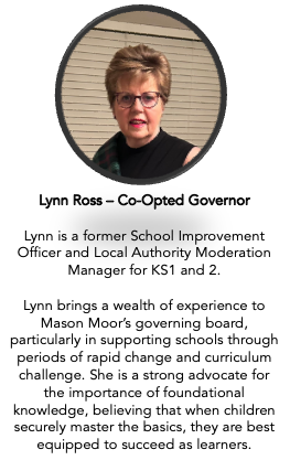 Mason Moor Governors are each assigned to support and monitor the work of the school. This is in conjunction with our school's School Development Plan and the Governor Monitoring Schedule.